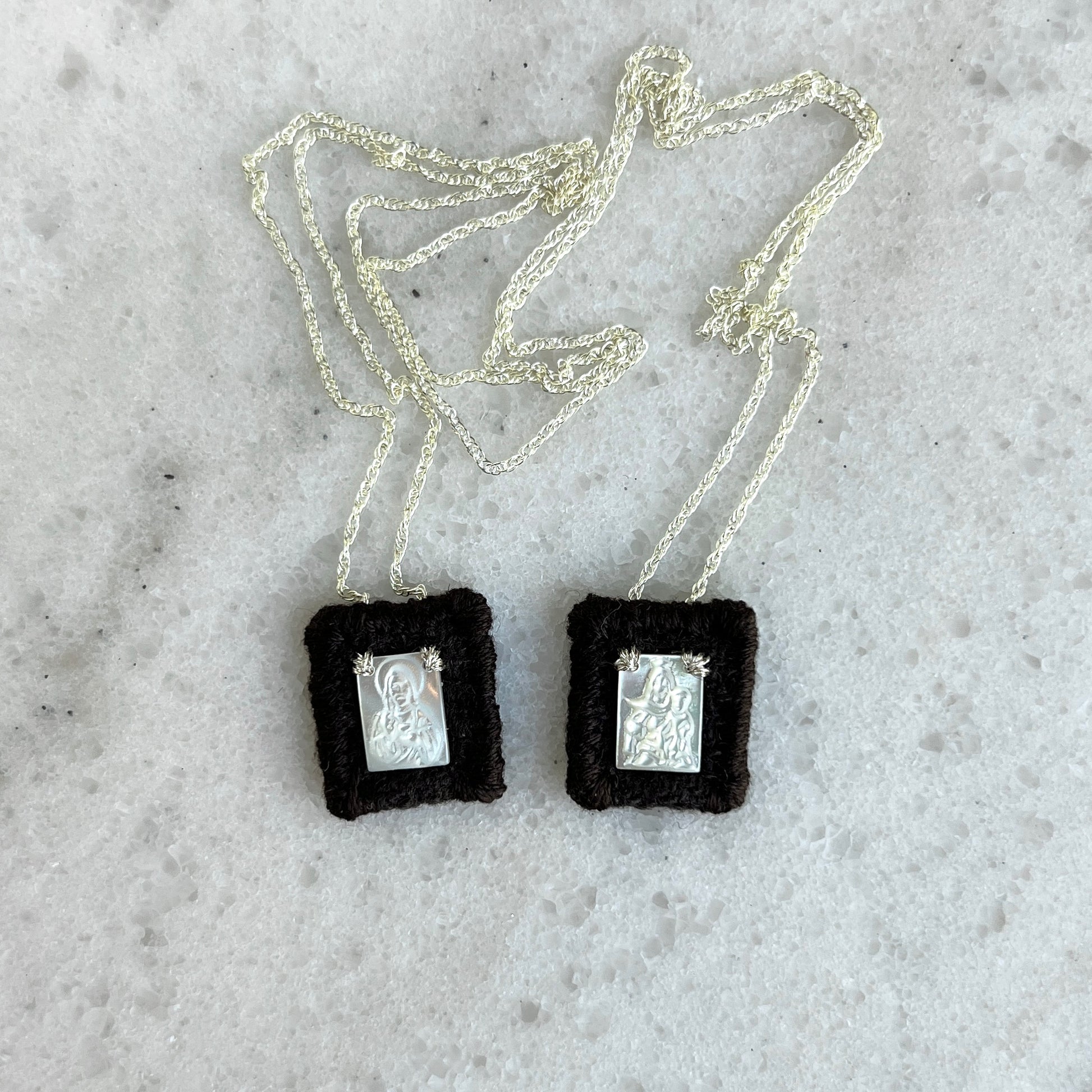 This handmade and hand sewn brown scapular necklace fulfills the requirement of Our Lady in order to obtain the graces of wearing the Brown Scapular for those who are enrolled and combines it with a jewelry style chain for either everyday wear or as a special occasion piece.