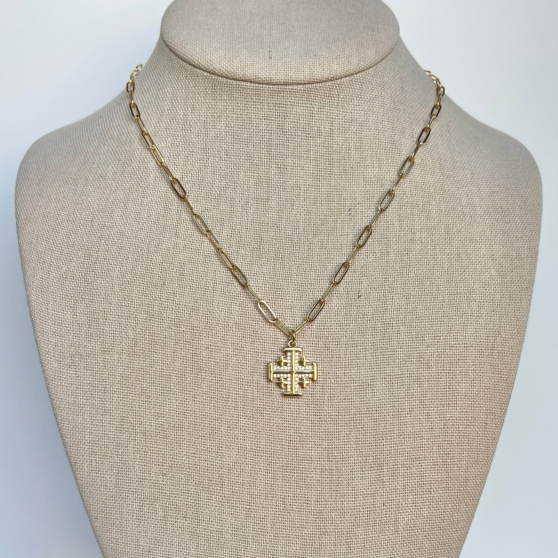 This beautiful necklace features a gold filled CZ adorned Jerusalem Cross with your option of gold filled chain. This pendant is available with either a 16” simple chain with 2” extender or 16” paperclip chain plus 2” extender. Paperclip version can also be shortened to any desired length due to the style of the chain.