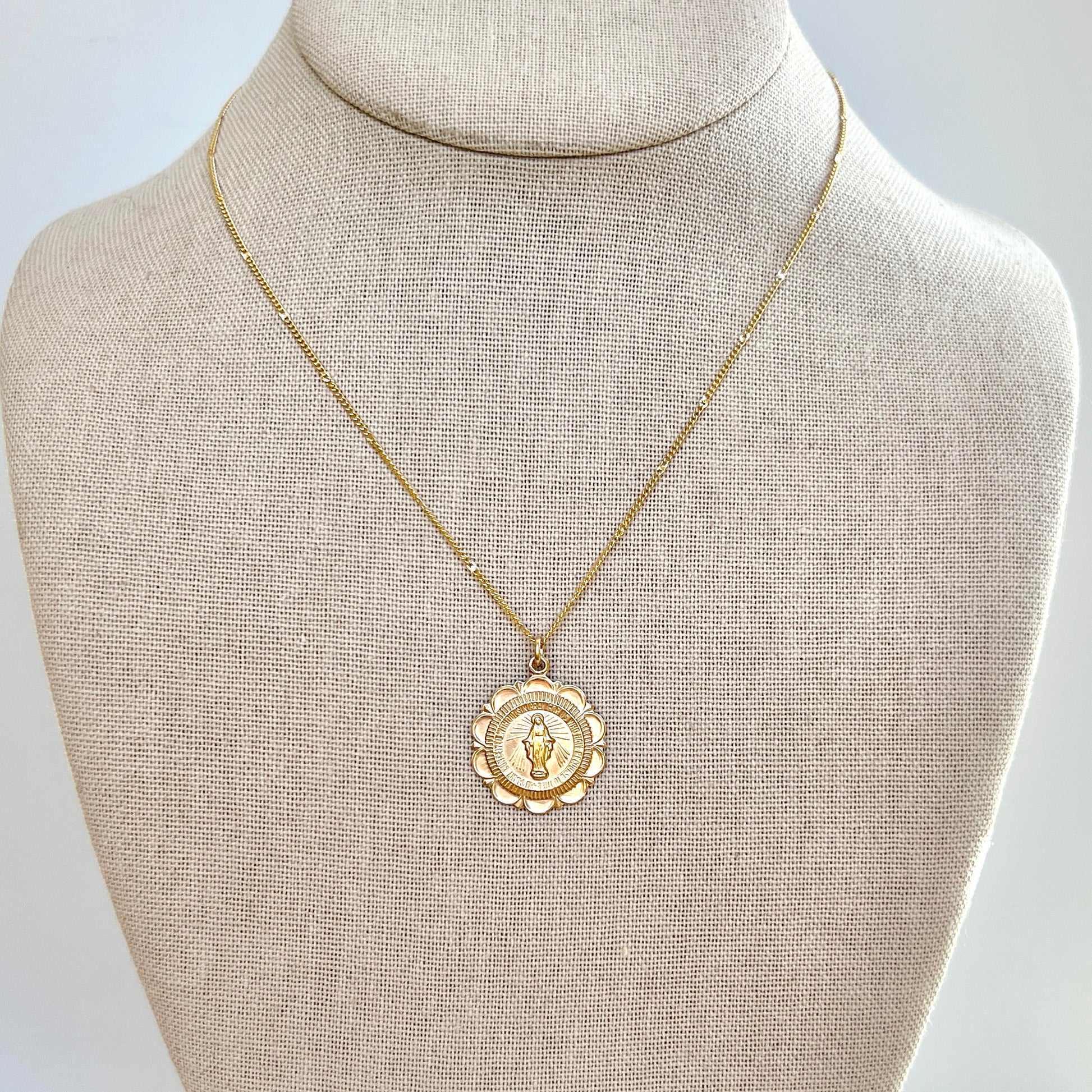 This necklace features a 16” gold filled radiant sunburst curb chain style necklace which holds a large gold filled double-sided scalloped Miraculous Medal pendant. Necklace includes a gold filled 2” extender for the perfect length.